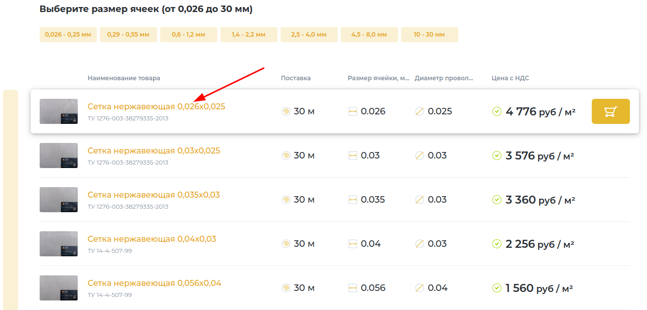 (*В случае если необходим раскрой сетки, можно добавить размеры нажав кнопку «Заказать раскрой сетки» [2]