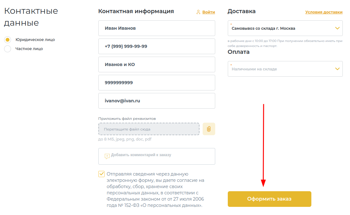 Ниже блока с товарами заполните данные о покупателе, это может быть как юридическое, так и физическое лицо.